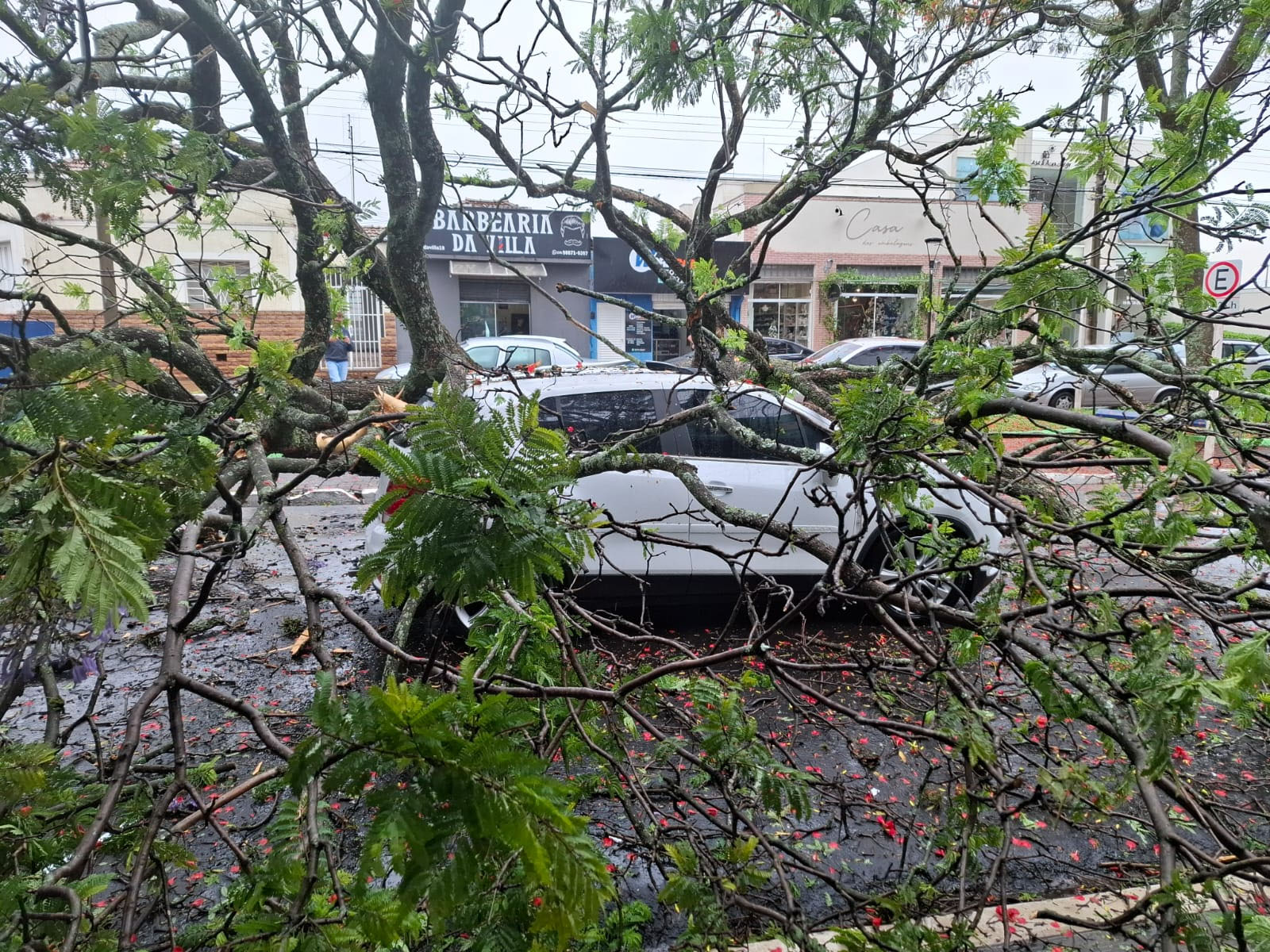 Uma grande árvore caiu em cima de um carro nesta tarde de sexta-feira, 8 de novembro de 2024, na Rua Larga, São Carlos-SP.