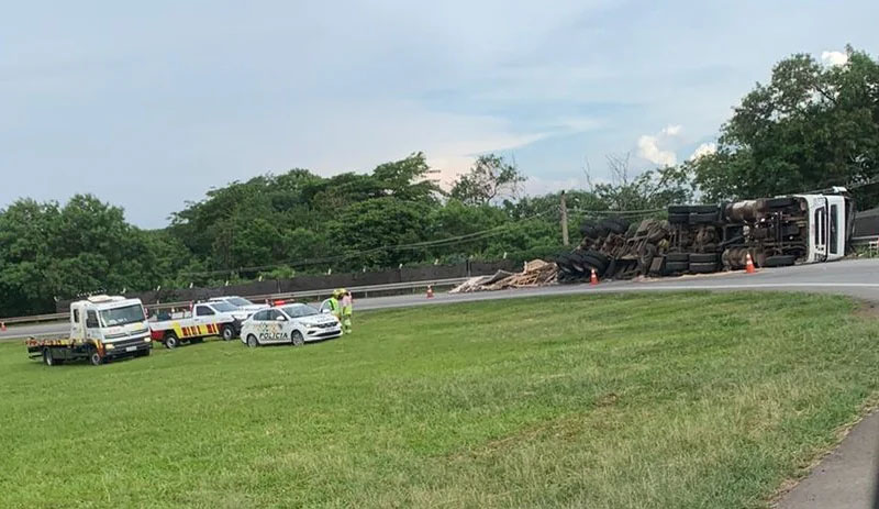 Uma carreta tombou nesta tarde de sábado, 30 de novembro de 2024, na alça de acesso da Rodovia Washington Luís (SP-310), com a rodovia Anhanguera (SP-330), em Cordeirópolis (SP).