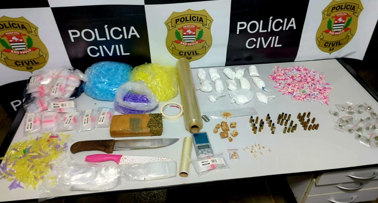 A Polícia Civil do Estado de São Paulo/ por meio da Delegacia de Investigações Sobre Entorpecentes de São Carlos , durante cumprimento de mandado de busca e apreensão, fato este ocorrido nesta tarde de terça-feira, 10/12/2024, em uma residência no bairro cidade Aracy, efetuou a prisão em flagrante de uma mulher (G. A. C. S – 37 anos) pela prática dos crimes de tráfico de drogas e posse ilegal de arma de fogo de uso restrito. A presa foi surpreendida em uma casa bomba. Na ocasião da vistoria policial, foram localizados 217 microtubos contendo cocaína (142g), 13 porções de elevado teor de pureza contendo cocaína (521g), 25 porções de “maconha” (28g), 1 tijolo de maconha (661g), 23 pedras individualizadas mais 8 porções a granel de crack (58g), além de aparelhos celulares, microtubos vazios, plástico filme, “ziplocks” e balança de precisão e munições de calibre .40, .38 e .357. Após ser autuada em flagrante pelo delegado, Dr. Miguel Capobianco Bianco Junior, foi recolhida ao Centro de Triagem local.