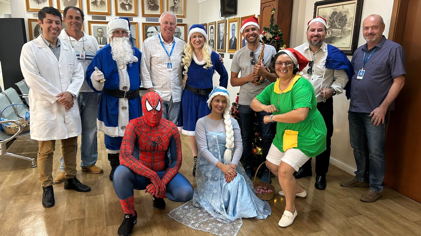 O espírito natalino tomou conta da Santa Casa de São Carlos e da Maternidade graças à ação do Instituto Marino e do Grupo Sinsef, que trouxeram personagens icônicos para alegrar pacientes, colaboradores e visitantes. Papai Noel, Mamãe Noel, Elsa (do filme "Frozen"), Chiquinha (do "Chaves") e até o Homem-Aranha participaram da iniciativa, acompanhados por um saxofonista que emocionou a todos com melodias natalinas.