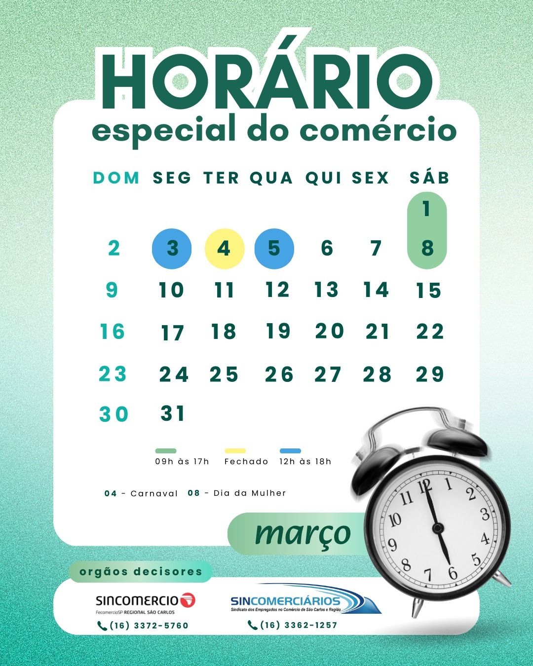 A Associação Comercial e Industrial de São Carlos (ACISC) divulgou nesta quarta-feira (26) o horário especial de funcionamento do comércio para o mês de março. Os ajustes visam atender a demanda dos consumidores durante o período de Carnaval, proporcionando mais comodidade para as compras.