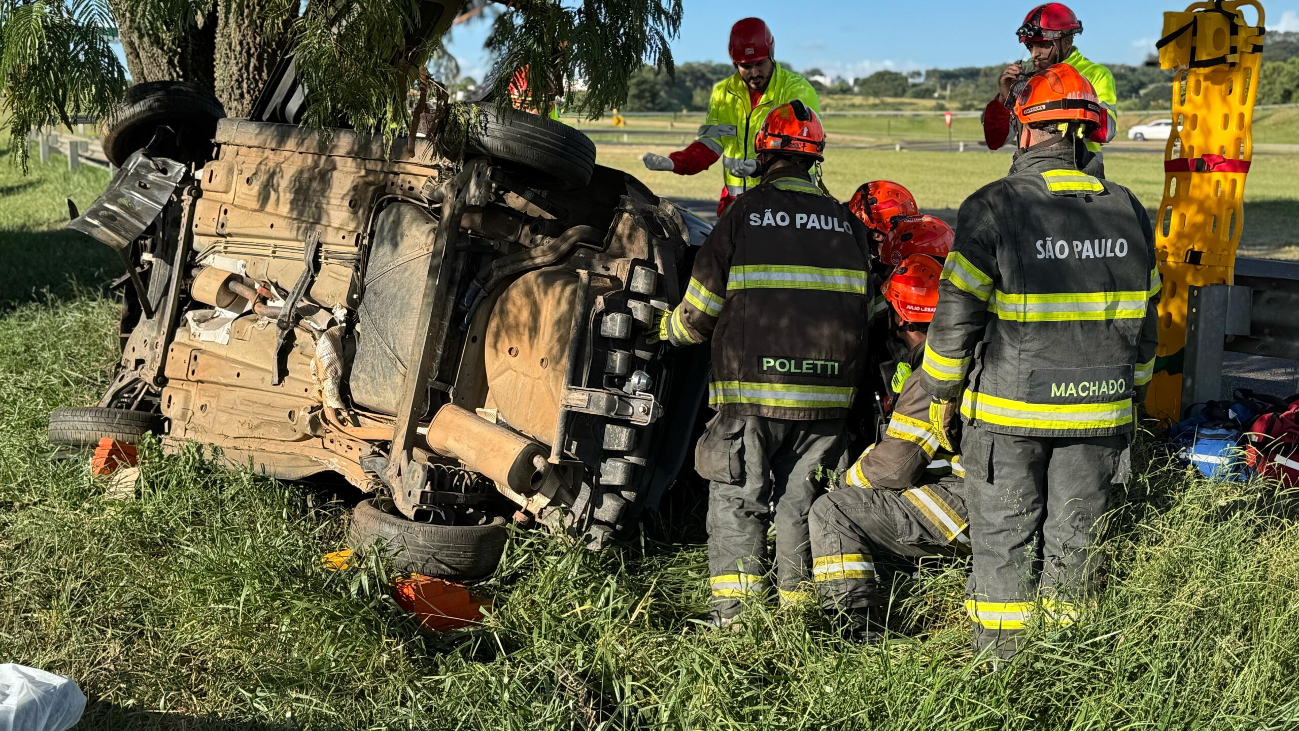 Um homem escapou da morte nesta tarde de quarta-feira, 5 de março de 2025, ao perder o controle de seu carro e colidir violentamente em uma árvore na curva de acesso da rodovia Washington Luís, com a rodovia SP-215, São Carlos-SP. O acidente ocorreu por volta das 16h20.