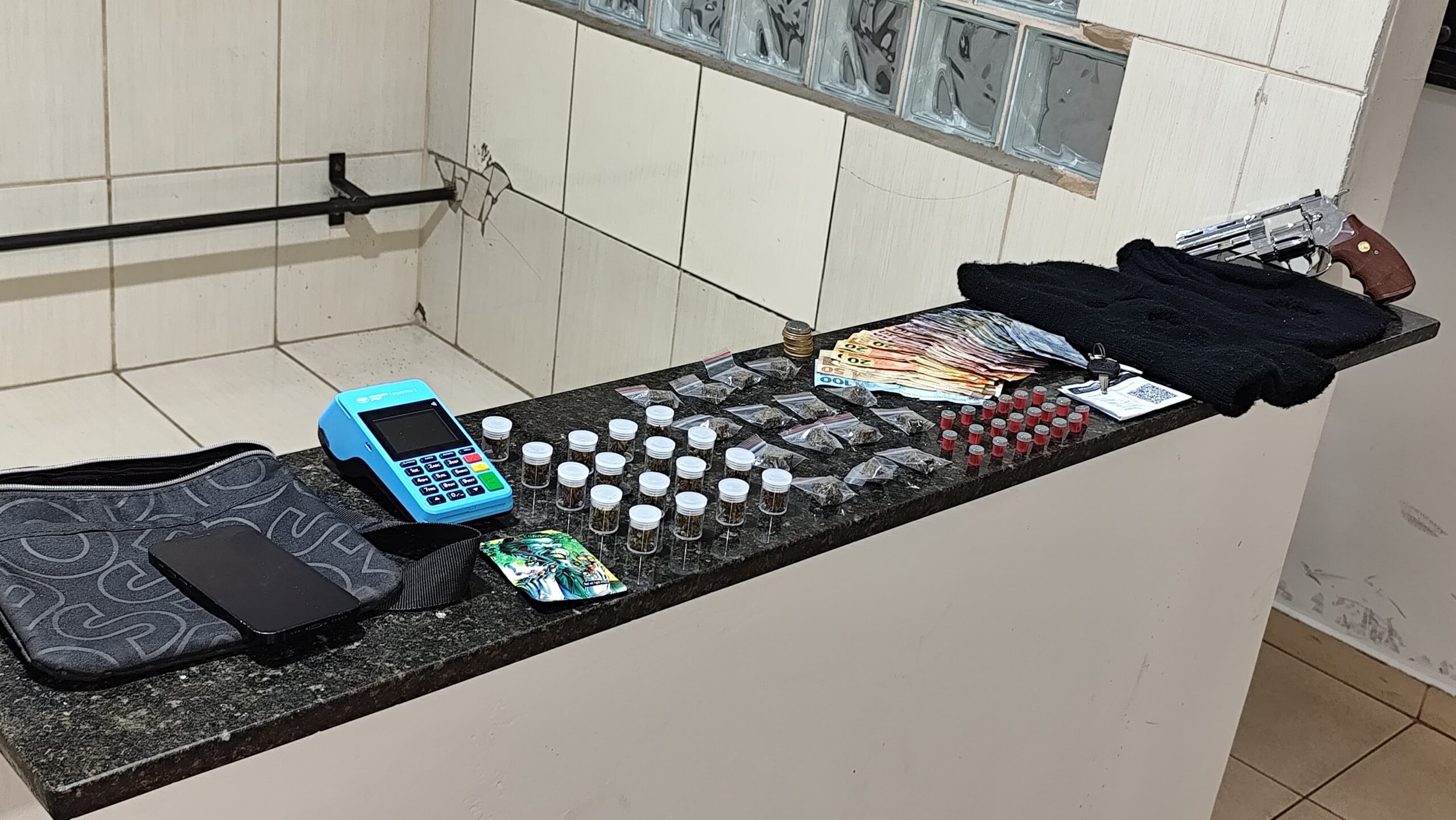 Em sua posse, no interior da mochila, foram localizadas drogas prontas para a venda, dinheiro e uma máquina de cartão.