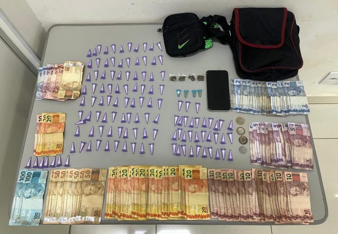Durante a abordagem, os policiais encontraram com os suspeitos 130 gramas de cocaÃna (divididas em 121 porções), 5 gramas de maconha (4 porções), 5 gramas de crack (3 porções), além de R$ 1.734,50.