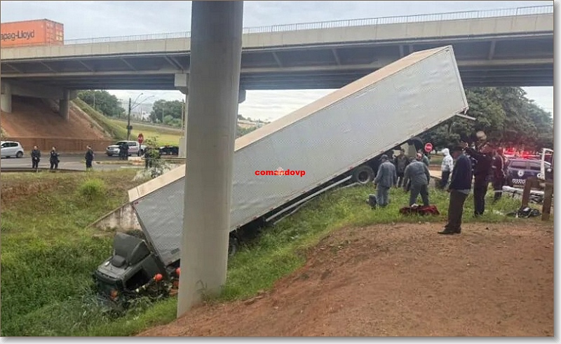 Segundo informações, o motorista teria perdido o controle da direção da carreta, andando uns 400 metros e caÃdo na vala.  O motorista sofreu ferimentos leves e foi socorrido. Equipes da concessionária, PolÃcia Militar Rodoviária, Corpo de Bombeiros e SAMU foram acionadas para atender a ocorrência. O tempo estava nublado no momento do acidente.