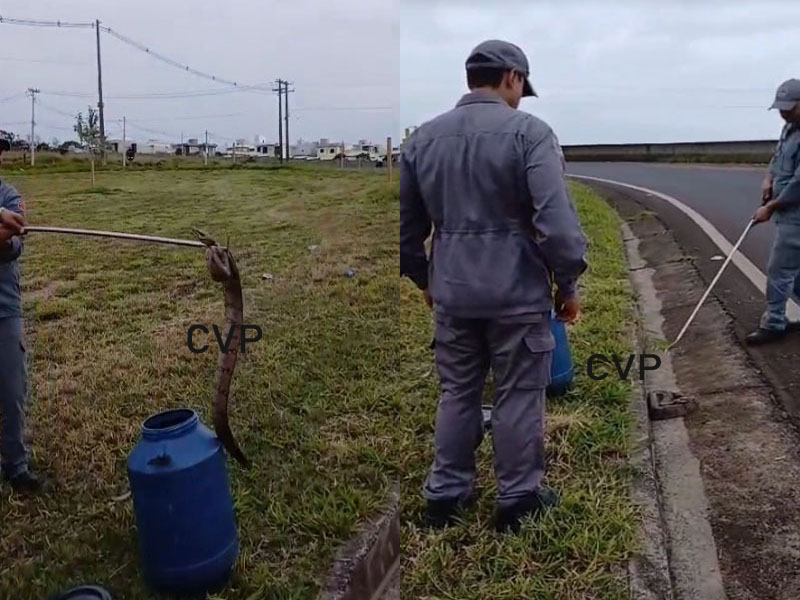 A equipe chegou rapidamente ao local e realizou a captura com extremo cuidado, como mostram as imagens registradas por Valdir Penteado. A operação foi bem-sucedida e a jiboia será devolvida ao seu habitat natural, longe do tráfego e do risco de morte.