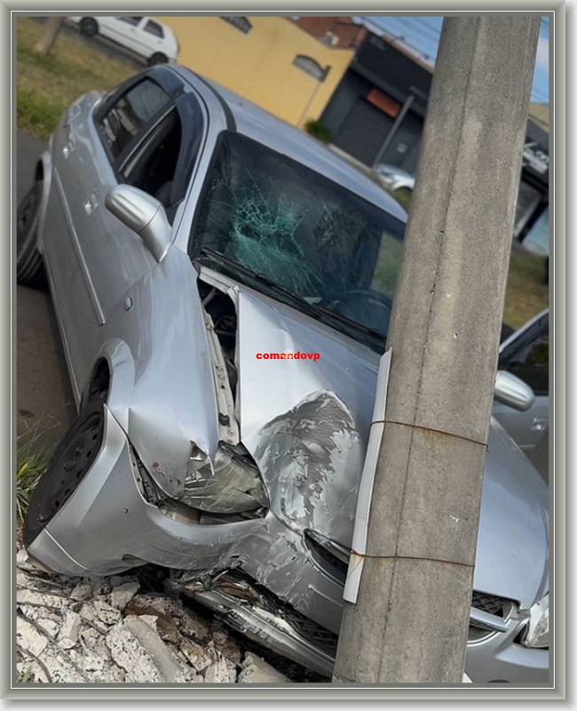 Um poste foi danificado por um carro nesta tarde de sexta-feira, 4 de julho de 2025, na Avenida Regit Arab, bairro Cidade Aracy, em São Carlos-SP. A motorista teria sofrido um mal súbito, perdido o controle da direção do Corsa e colidido no poste.
