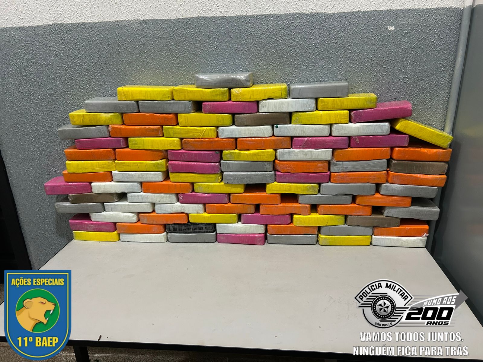 Em vistoria realizada na residência do indivÃduo, foram encontrados 90 tijolos de crack, totalizando 95,978 kg. Diante dos fatos, a ocorrência foi apresentada à Central de PolÃcia Judiciária, onde o delegado de plantão,  lavrou o Boletim de Ocorrência de Tráfico de Drogas e recolheu o indivÃduo à carceragem.