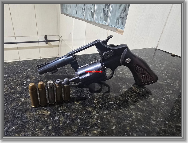 O suspeito saiu correndo, subiu no telhado e caiu ao solo. Depois levantou e se escondeu debaixo da cama de uma casa. Ele reagiu mais uma vez. Os PMs tiveram que fazer uso de força moderada para conter o suspeito. Na busca pessoal, foi encontrado um revólver escondido na região genital. O armamento calibre 38, estava com cinco munições intactas e com a numeração suprimida. O detido disse que há uma semana havia sido esfaqueado e que estava usando a arma para proteção pessoal. I.S. V, foi encaminhado para a UPA e depois apresentado na Central de Polícia Judiciária, onde foi autuado em flagrante por porte ilegal de arma de fogo e recolhido ao Centro de Triagem de São Carlos.