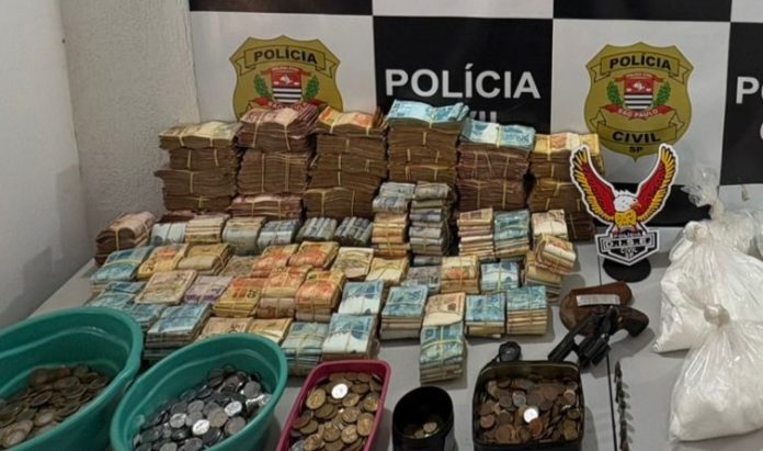 A maior surpresa foi a quantidade de dinheiro guardada no local. Após a contagem, foi confirmado o montante de R$ 475.430,00 em espécie, valor que reforça a suspeita de forte atuação no tráfico.