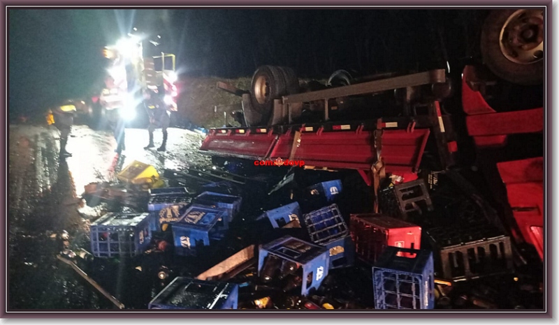 Um caminhão carregado com cerveja tombou na noite de quarta-feira, 20-08-2025, no km 264 da rodovia Washington Luís, região de Araraquara-SP.