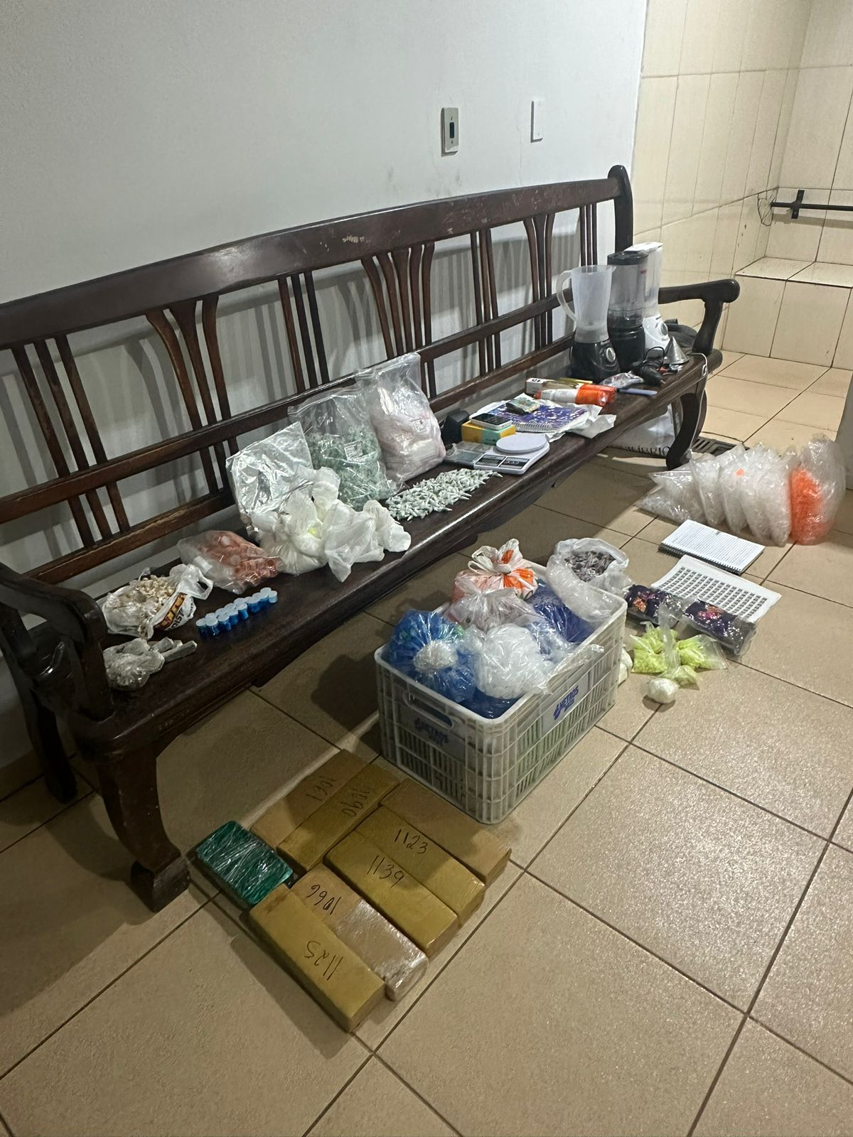 Apreendido: - 07 Tijolos de Maconha - 01 Tijolo de Crack - 12 Porções Brutas de Maconha - 552 Comprimidos de Ecstasy - 233 Porções de Maconha - 238 Microtubos com Cocaina - 314 Pedras de Crack - 09 Porções Brutas de Cocaina - 01 Porção de Ecstasy - 84 Porções de Dry - 15 Porções de Ice - R$ 1445,00 - 17 mil microtubos vazios - Caderno com Anotações Referente ao Tráfico - Petrechos para o embalo - Fiat/Palio DBV-3295 Totalizando: 12.462 Kg