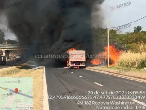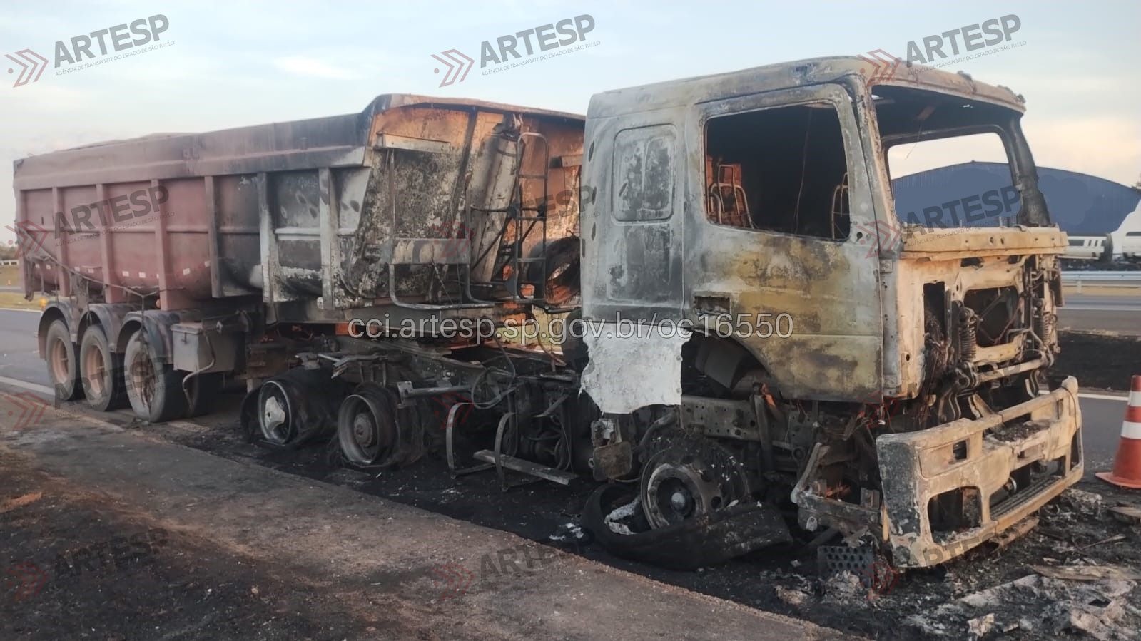 Um caminhão ficou completamente destruído por um incêndio na tarde de sábado, 20-09-2025, no km 162 da rodovia Washington Luís, região da cidade de Santa Gertrudes-SP.