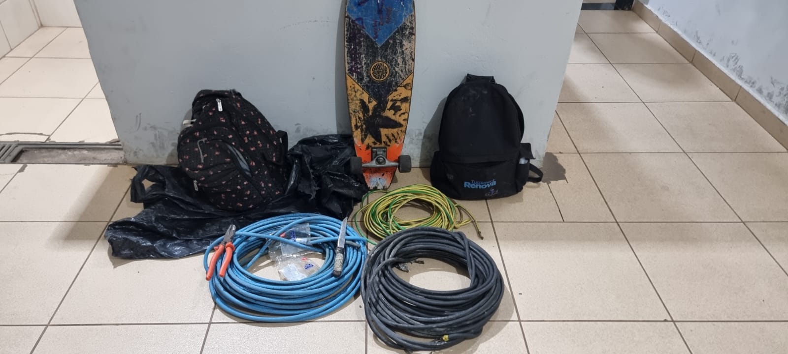 De acordo com informações, a GM estava estacionada no Parque Linear, com a finalidade de inibir furtos de fiação no local, quando dois indivÃduos foram avistados atravessando o parque carregando dois sacos pretos, aparentando peso excessivo. Foi realizada a abordagem, e constatado que no interior dos sacos havia grande quantidade de fios, além de 01 alicate e 01 faca. A dupla foi encaminhada para a Central de PolÃcia Judiciária, onde os fios foram apreendidos. Os averiguados foram liberados.
