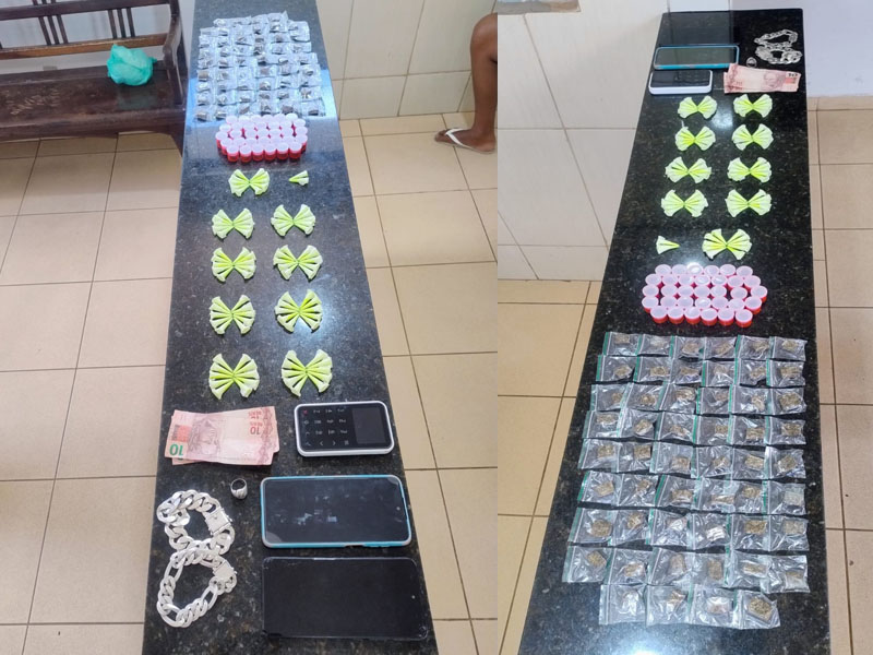 De acordo com informações, a PM foi acionada para atender uma ocorrência de tráfico de drogas. No local os policiais abordaram dos dois menores e com um foram localizados vinte reais e duas porções de maconha. Com o outro foi localizada uma máquina de cartão. Os menores confessaram que estavam no local vendendo drogas. Nas proximidades foram apreendidos 92 pinos de cocaÃna, 33 tubos com Super Lemon Haze e  52 papelotes com maconha. A dupla foi encaminhada para a Central de PolÃcia Judiciária, onde ficou à disposição da famÃlia.