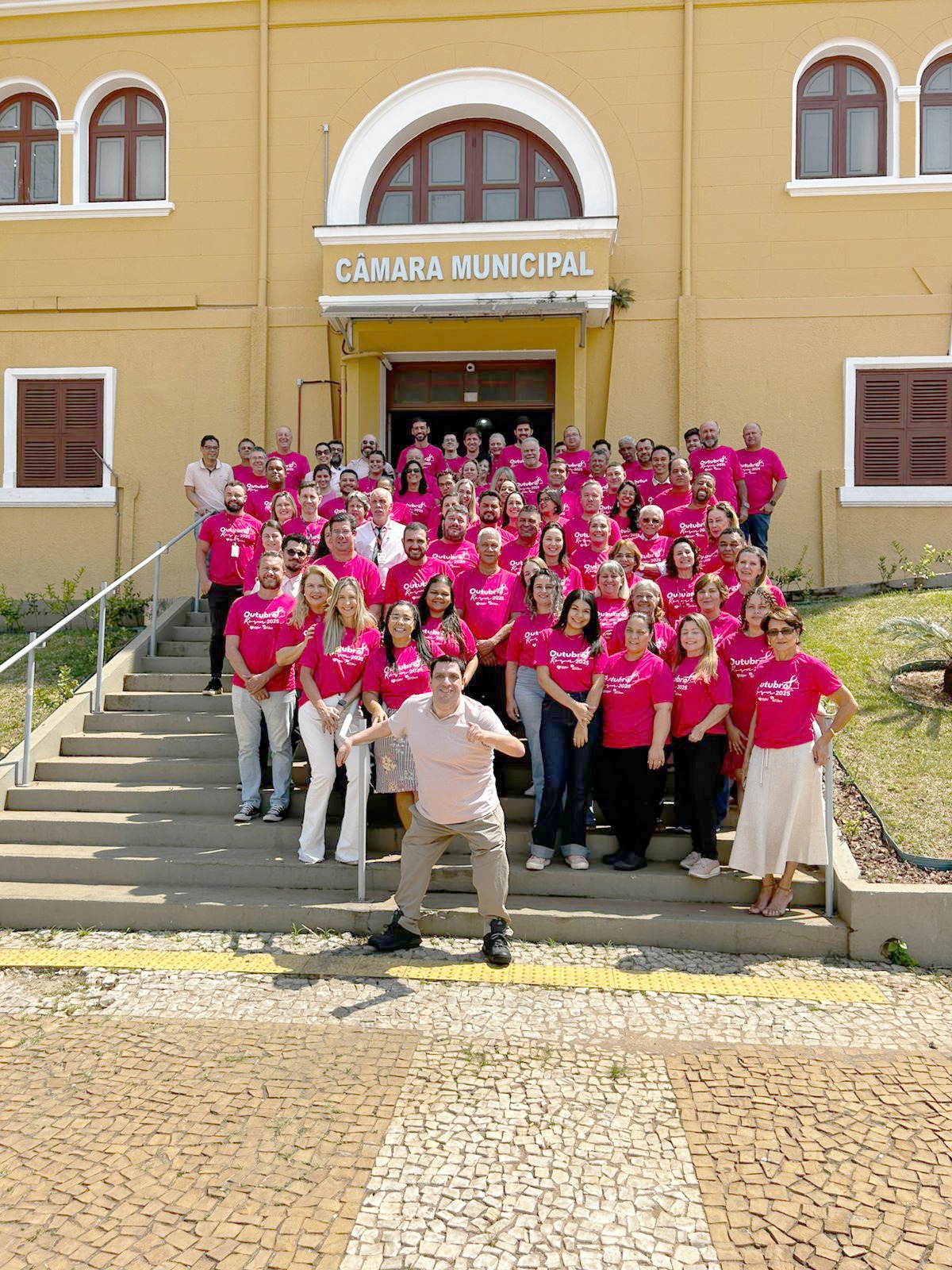 Em parceria com a Prefeitura Municipal, a Câmara Municipal de São Carlos participou na manhã desta terça-feira, 7, de uma ação de conscientização sobre a Campanha Outubro Rosa, uma campanha que tem como objetivo reforçar a importância da saúde da mulher e alertar sobre a prevenção do câncer de mama. Durante a manhã, os vereadores, vereadoras, assessores, estagiários e servidores da Câmara, foram convidados a vestir rosa e, se possível, doar um pacote de fraldas infantis ou geriátricas. As fraldas foram trocadas por camisetas do Outubro Rosa e destinadas a entidades assistenciais, em parceria com o Fundo Social, presidido pela primeira-dama Herica Ricci Donato, e com a Secretaria Municipal de Saúde.