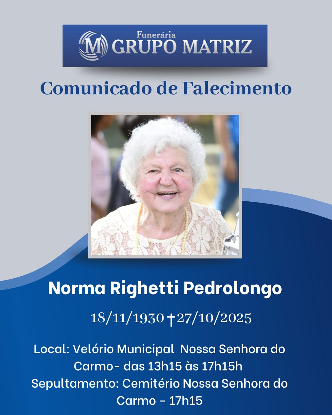 É com imenso pesar que comunicamos o falecimento da Sra. Norma Righetti Pedrolongo. Faleceu no dia 27/10/2025 em São Carlos -SP com 94 anos de idade. Era viúva do Sr. Carlos Donato Pedrolongo. Deixa os filhos Carlos Augusto c/c Marilce, Maria Elisa c/c Antônio Carlos, Nilton( in memoriam) c/c Sandra, Norma Sueli, os demais familiares e amigos. O inicio do velório está previsto para às 13h15min no dia 27/10/2025 no Velório Municipal. O sepultamento dar-se-á no dia 27/10/2025 ás 17h15min, saindo o féretro do Velório Municipal para o Cemitério Nossa Senhora do Carmo.   A Funerária Grupo Matriz expressa suas condolências e pede a Deus que conforte os familiares neste momento de dor.
