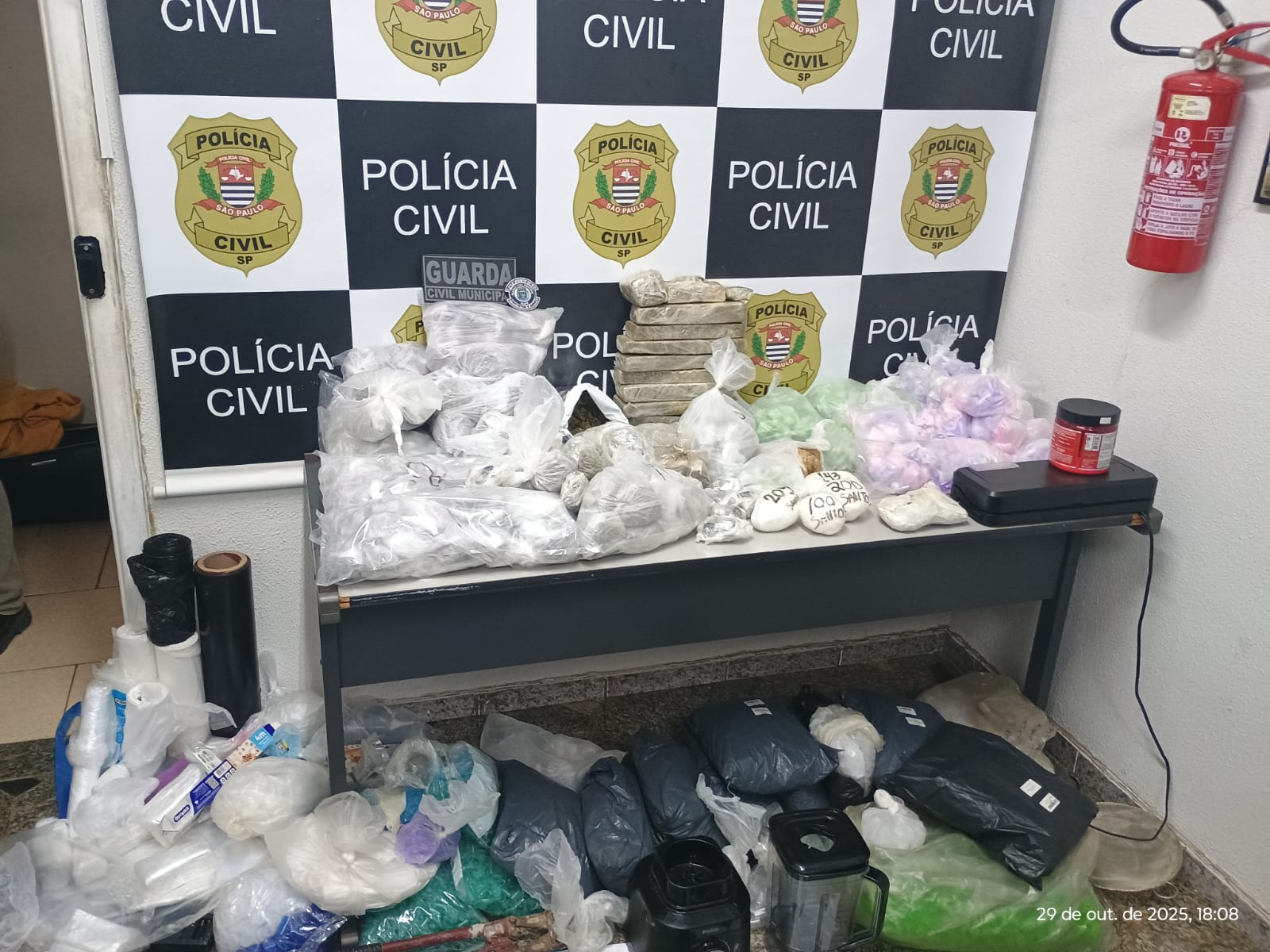 De acordo com informações, a Guarda Civil Municipal  foi acionada para prestar apoio um Oficial de Justiça,  durante o cumprimento de mandado de reintegração de posse em um imóvel e no local foi localizada muita droga e materiais utilizados para o preparo e embalagem de entorpecente. No total foram apreendidos 22,824 quilos de drogas. A ocorrência foi encaminhada para a Delegacia da PolÃcia Civil, onde todo o material foi apreendido. Ninguém foi detido.