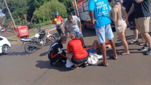 De acordo com informações, a moto ocupada por duas mulheres estava na mesma direção do carro.  O carro teria tentado mudar de faixa e acabou colidido com a amoto. A jovem de 25 anos, que estava na garupa da moto caiu e sofreu algumas escoriações. O SAMU foi acionado e socorreu a vÃtima e a encaminhou para a Santa Casa. A condutora do carro e a da moto, nada sofreram.