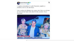 Em postagem no Twitter, Eduardo Bolsonaro afirmou: “O regime venezuelano é o pilar financeiro, logístico e simbólico do Foro de São Paulo. Com a captura de Maduro vivo, agora Lula, Petro e os demais do Foro de São Paulo terão dias terríveis, anotem. Viva a liberdade!”