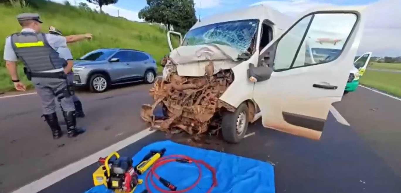 Uma motorista ficou preso nas ferragens de uma van nesta manhã de sexta-feira, 13 de fevereiro de 2026, em um gravíssimo acidente na rodovia Washington Luís, região de Araraquara-SP. A van teria colidido na traseira de um caminhão carregado com combustível.