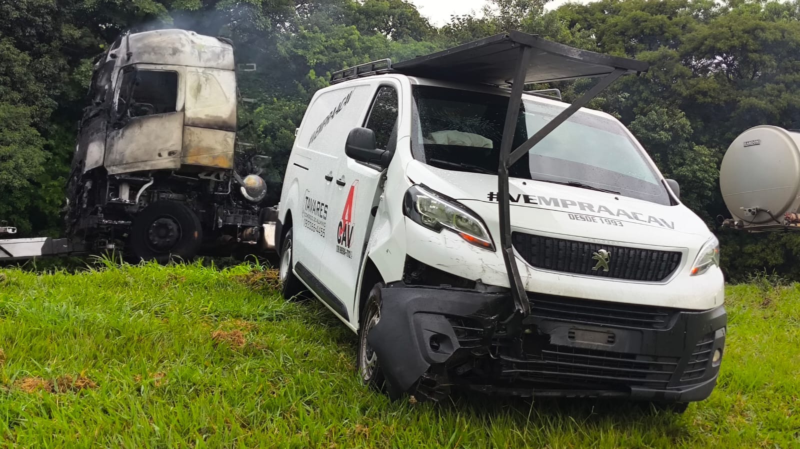 De acordo com informações,  o acidente ocorreu no sentido interior/capital. Dois veÃculos pequenos e dois caminhões colidiram e um dos caminhões, o qual estava carregado com combustÃvel  acabou pegando fogo. Um homem de 69 anos ficou levemente ferido e foi socorrido. Devido à gravidade da situação, as pistas nos dois sentidos foram interditadas e causou um grande congestionamento. A PolÃcia Militar Rodoviária esteve no local e tomou as medidas cabÃveis.
