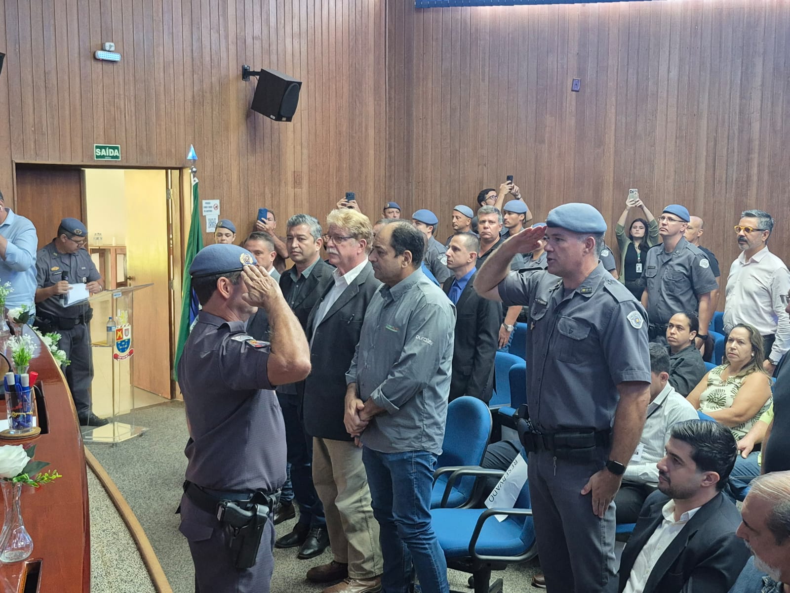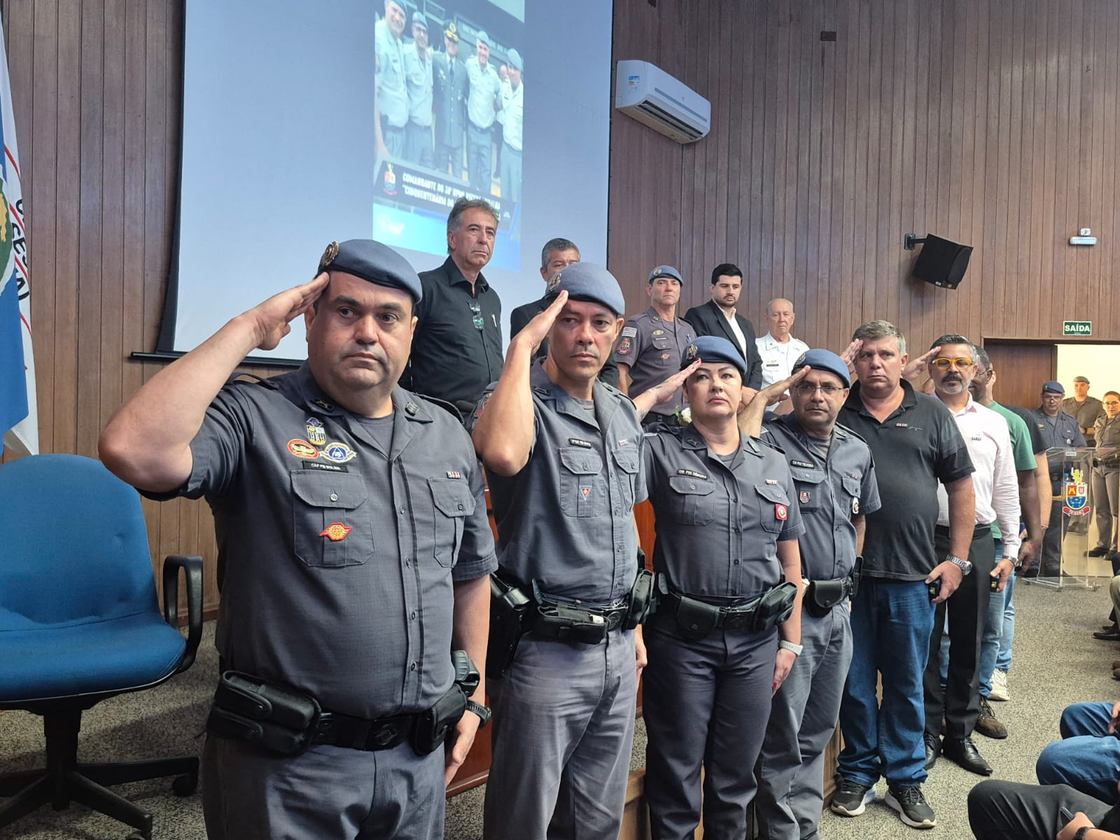 O secretário de Segurança Pública de Ibaté, Major Luis Fumagale, e o secretário de Governo, Fábio Gomes, estiveram na cidade de São Carlos para participar da cerimônia realizada pelo 38º Batalhão da Polícia Militar, que homenageou policiais militares de destaque.