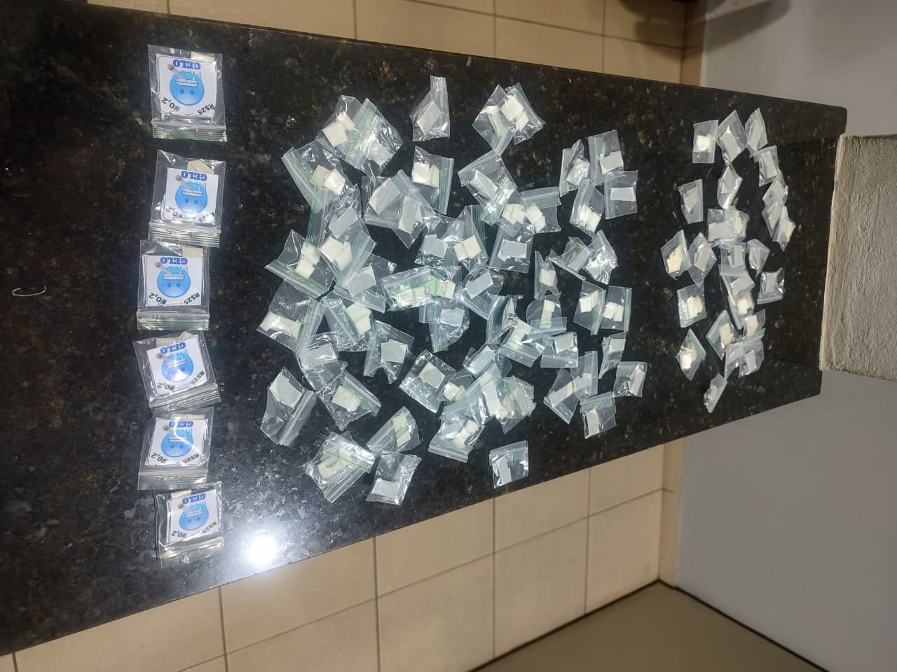 De acordo com informações, policiais receberam denúncia, que um casal estaria sequestrado e apanhando dentro de um apartamento do DCHU. Os policiais estavam indo averiguar tal denúncia, quando avistaram um indivíduo no condomínio III, bloco II. Este estava mancando e subiu correndo as escadas . Os policiais desconfiaram do indivíduo e deram ordem de parada, mas ele não obedeceu. Os policiais foram no encalço e detiveram C.H.P.R, no último andar do prédio. Ele tentou esconder drogas no lixo. Em revista pessoal foram localizados no bolso direito de sua bermuda 06 papelotes de “ice”. No interior do lixo foram localizadas duas embalagens plásticas contendo 80 porções de “dry”. O detido confessou que estava traficando no local. E a respeito de estar mancado, era porque havia sofrido um acidente de moto e estava com dor nos testículos. O detido foi encaminhado para a UPA da Vila Prado e depois foi transferido para a Santa Casa, onde passou por atendimento médico e foi liberado. Ele foi apresentado na Central de Polícia Judiciária, onde foi registrado boletim de ocorrência de apreensão de objeto e foi liberado.