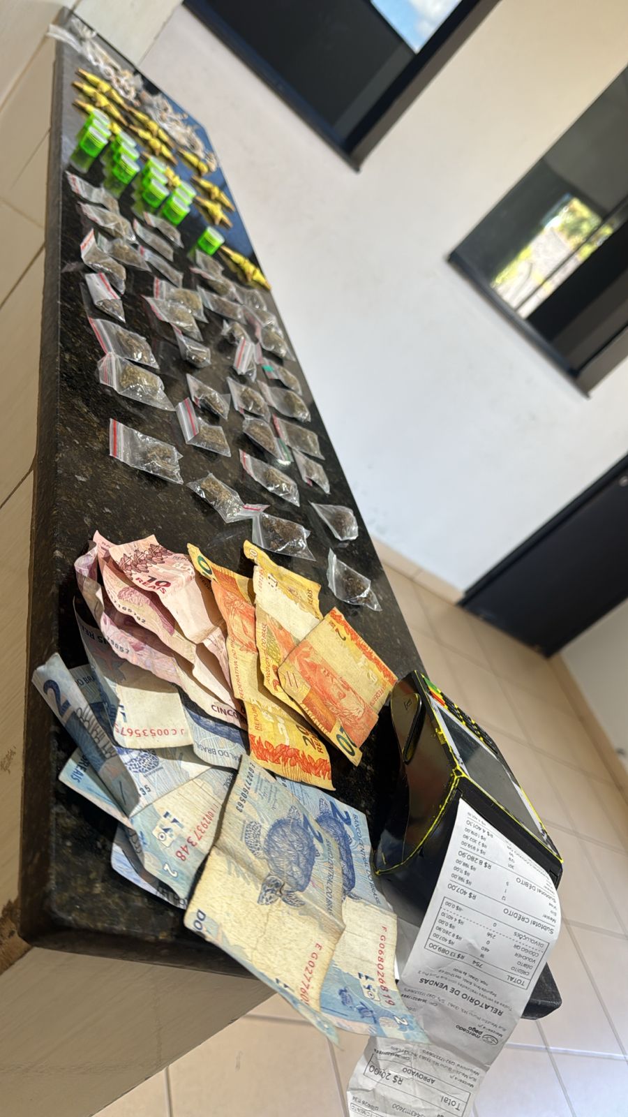 De acordo com informações, a PM estava em patrulhamento, quando avistou dois indivÃduos na via pública.  Ao perceberem a presença da equipe policial, o indiciado ocultou um objeto sob sua blusa e passou a se afastar. Diante disso, foi iniciado acompanhamento com a viatura, até que o indiciado adentrou em um terreno baldio, momento em que o depoente desembarcou e prosseguiu na perseguição a pé. Durante a fuga, já nos fundos do terreno, o indiciado dispensou, próximo a um muro, uma sacola e uma máquina leitora de cartão bancário, vindo em seguida a pular o muro. Ele foi detido. No interior da sacola, foram localizados R$ 17,00, trinta e uma porções de maconha, acondicionadas em invólucros plásticos, treze porções de maconha, em pequenos potes plásticos, setenta e duas porções de crack e vinte e nove porções de cocaÃna.  D. E.N, de 26 anos, teria confessado que estava no local vendendo drogas juntamente com um menor de idade.  O adolescente tentou fugir, mas também foi detido. Em sua posse foram encontrados R$ 80,00, quatro porções de maconha acondicionadas em invólucros plásticos idênticos à queles localizados com o indiciado, além de dez porções de cocaÃna. Inicialmente, o adolescente confessou que estava praticando o tráfico de drogas na companhia do indiciado, porém na delegacia da PolÃcia Civil, ele teria dito que somente ele estava na traficância.  O delegado plantonista ao tomar conhecimento dos fatos, autuou o maior em flagrante por tráfico de drogas e recolheu ao Centro de Triagem. O menor ficou à disposição da famÃlia.
