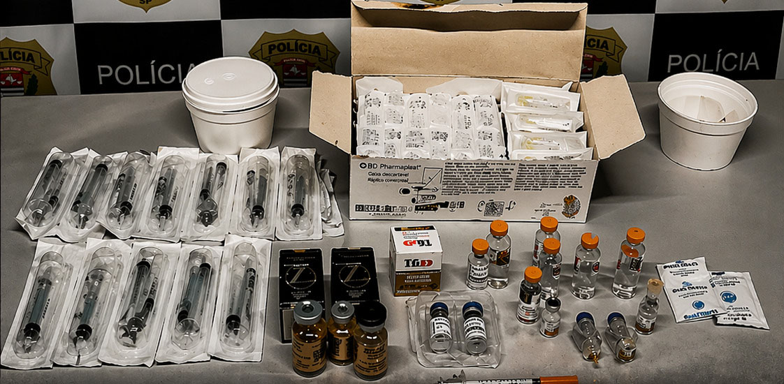 Foram apreendidos frascos de substâncias como tirzepatida e retatrutida, além de anabolizantes, seringas, agulhas e insumos utilizados para aplicação, localizados no estabelecimento e também em endereço ligado à investigada.