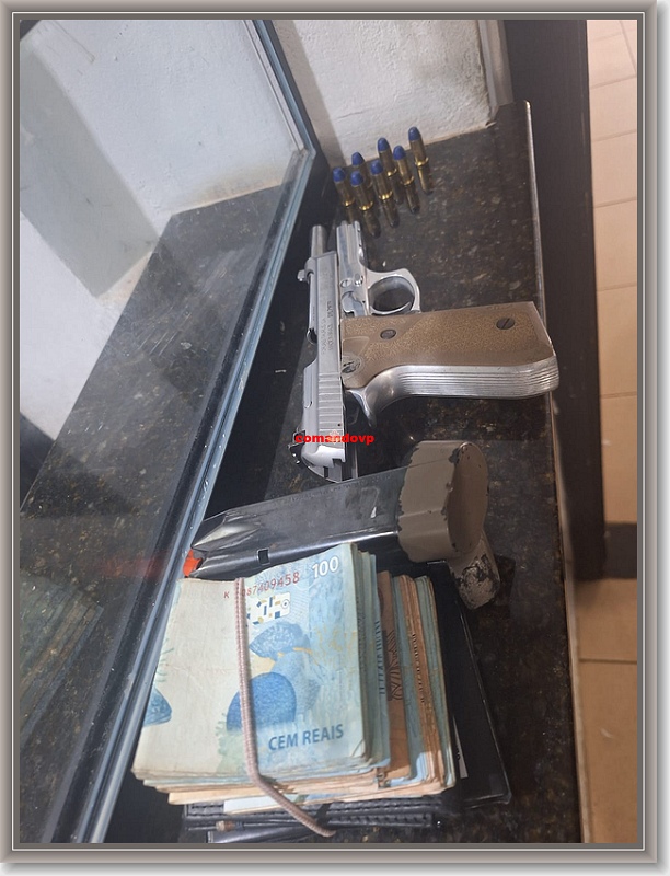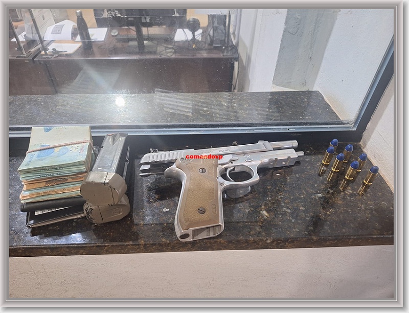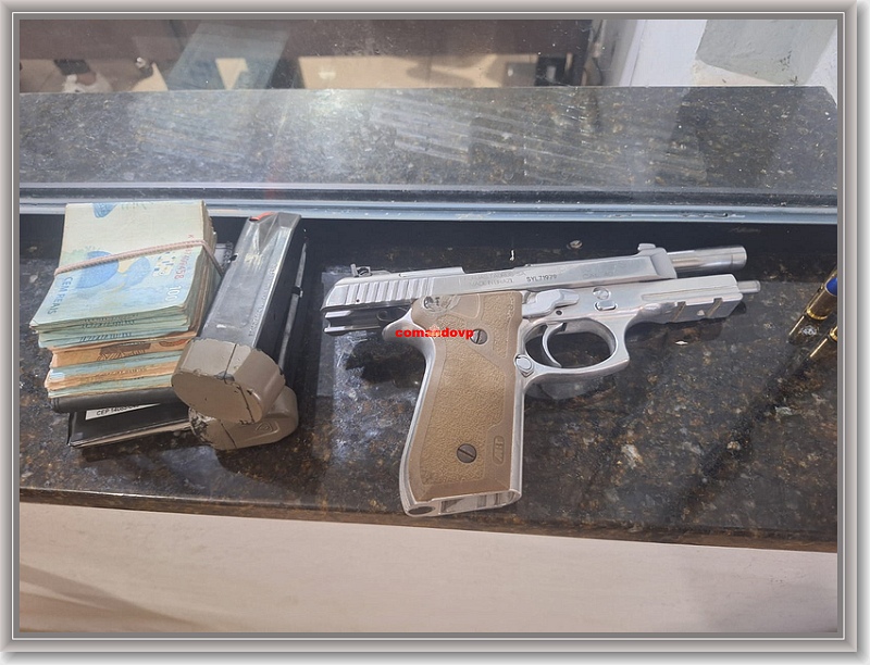 Nesta madrugada de domingo, 26 de abril de 2026, a PM deteve um indivíduo por violência doméstica e apreendeu uma pistola e munições na Rua Pedro Aparecida Gonzaga, bairro Cidade Arracy, São Carlos-SP. De acordo com informações, durante a madrugada, a PM foi acionada para atender uma briga de casal. Quando os soldados Lima e Bianca chegaram ao local, fizeram contato com a mulher de 33 anos, a qual relatou que ela e o marido haviam brigado e teria ocorrido agressão mútua. Ele estaria com uma arma de fogo. M.C.J, de 29 anos, estava na casa e foi abordado. Com ele nada de interesse policial foi localizado, porém,  dentro do carro foi encontrada uma pistola, seis munições e R$ 9.500,00. O detido foi encaminhado para a Central de Polícia judiciária, onde está sendo apresentado ao delegado de plantão, Dr. Maurício Antônio Dotta e Silvia. Foto: CVP