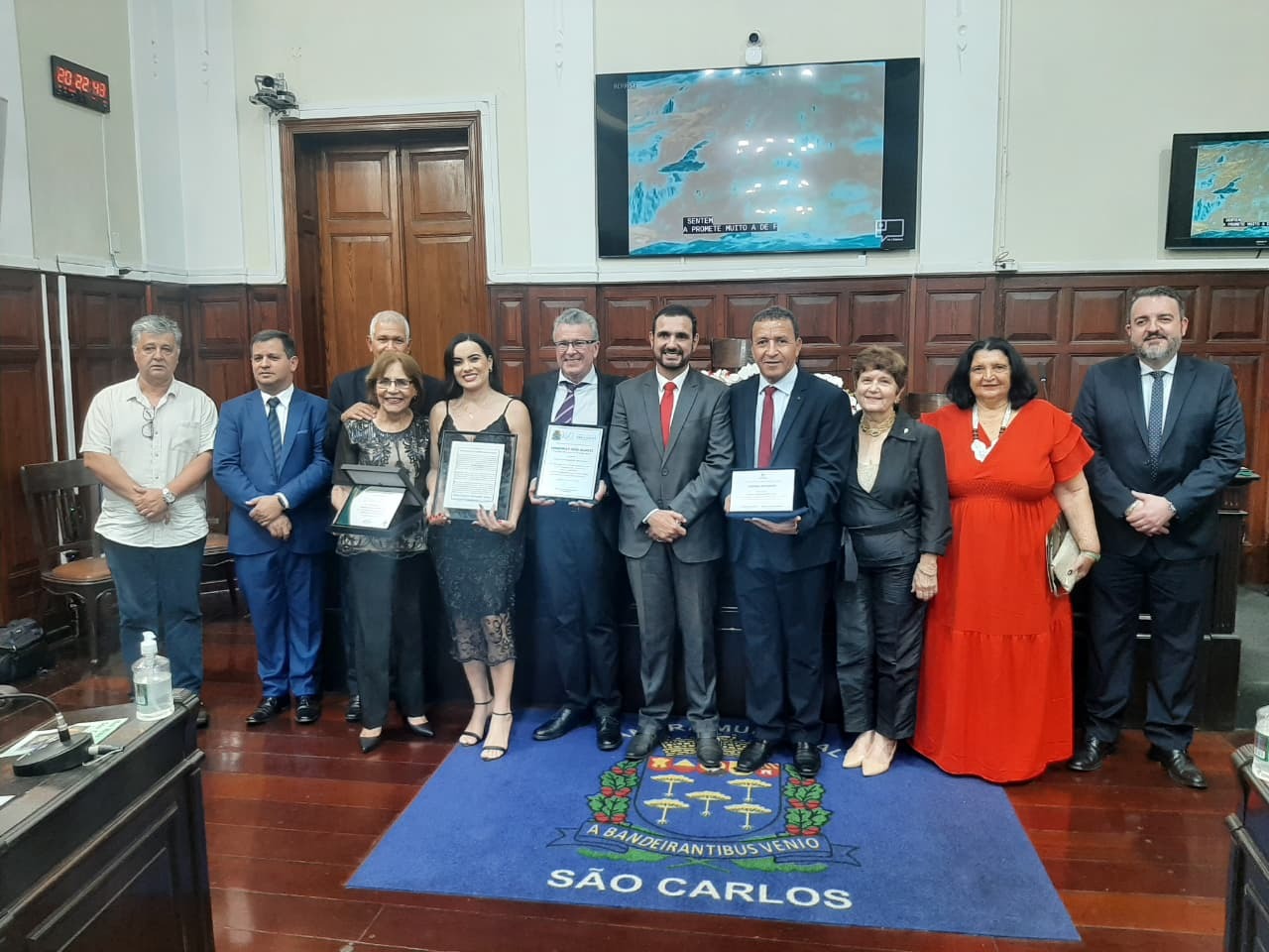 Acompanhada do vice-presidente Mozart Pedroso e dos diretores Reginaldo Ignácio e Eduardo Agazarian, Ivone destacou a trajetória inspiradora do empresário e sua contribuição para o fortalecimento do comércio de São Carlos A presidente da ACISC...